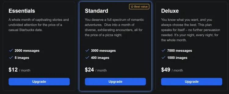 Crushon.ai has four plans—Free, Standard ($4.90/month), Premium ($7.90/month), and Deluxe ($29.90/month).