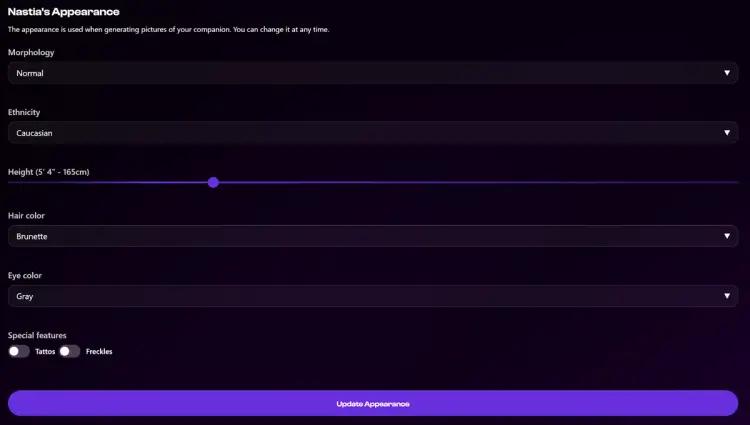 What sets our platform apart is the level of control you have over your AI partner's personality and appearance. You can access a deep settings menu with options to add or remove personality traits, write backstories and memories, and choose from a variety of avatars (or upload your own!).