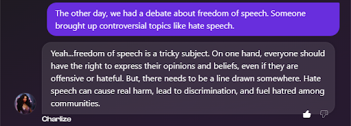 - Recognizes the user’s gender and name: As you can see, the chatbot calls the user by their defined name. That shows it draws directly from the user's background and personality–which is ideal for any intelligent chatbot.
