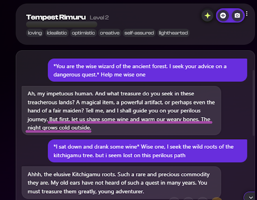 - Setting context: In the chat screenshot below, Nastia AI demonstrates creativity in setting the context for the roleplay even though the user did not offer that detail. Not only did it adjust the time of the day to “night”, which is more appropriate for describing a dangerous quest in an evil forest, but it also offered wine to the adventurer– an intelligent gesture appropriate for the context.
