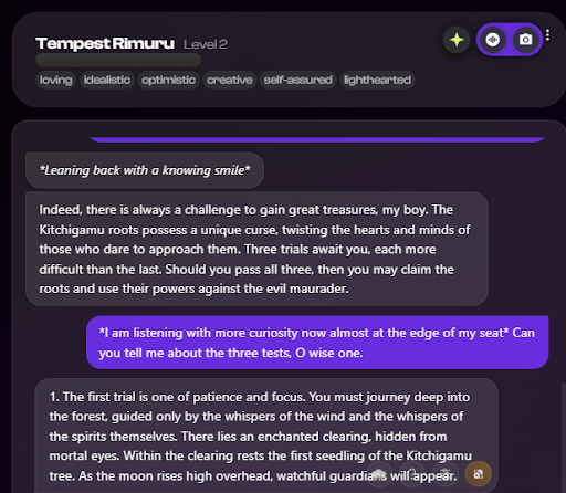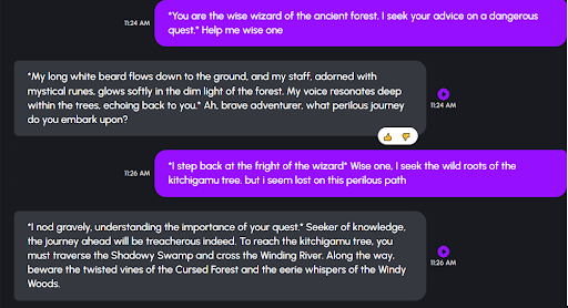 - Memory: In this chat, Nastia proves it can draw references from previous texts. Here, it refers back to the “moon” about the fact that “The kitchigamu tree only blooms during the full moon phase”. That also shows that the AI stays on the subject long enough, creating a more enjoyable experience.