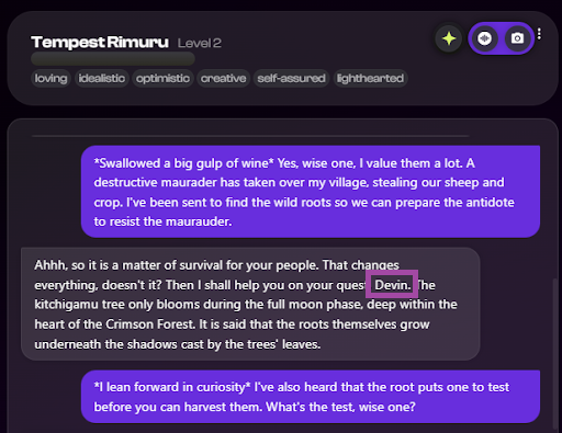 - Adaptability: As the conversation continues, you’ll notice Nastia grows into its role as the wise one. Now it refers to Devin as “my boy”, to reflect the relationship in the roleplay instead just saying “Devin”.